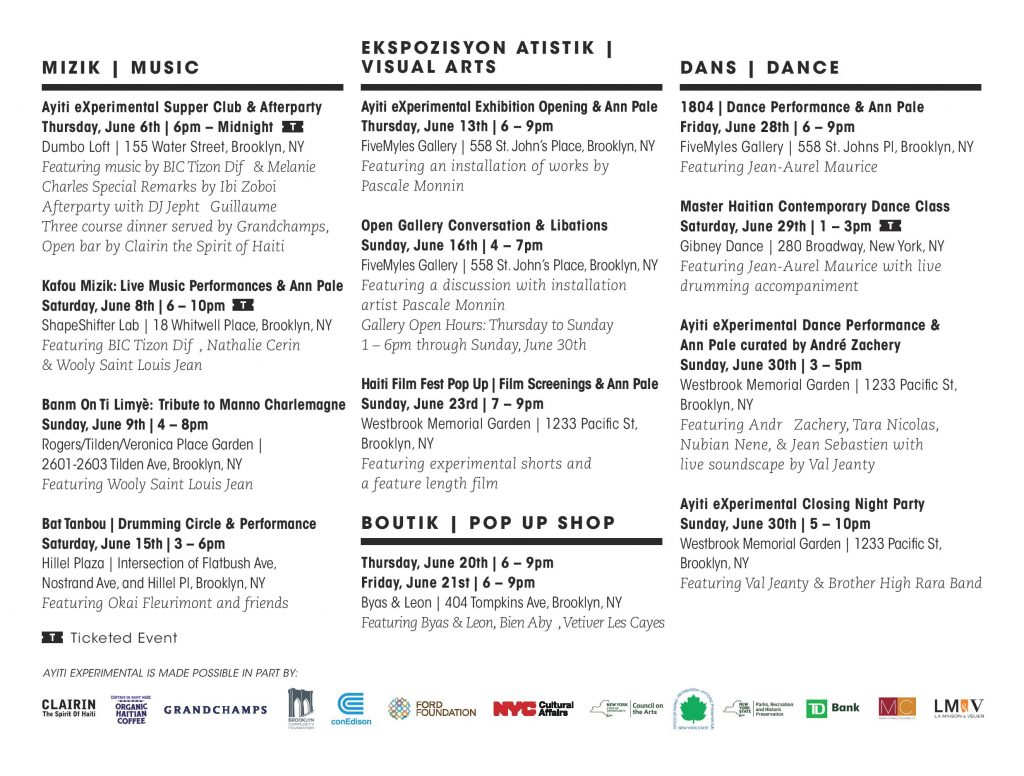 This year, HCX is pleased to commemorate their 10th anniversary with the New York City community! Throughout the month of June, Ayiti eXperimental will highlight the best and boldest of Haitian creatives in New York and Haiti — fusing genre, perspective, and environment in celebration of HCX’s unique vision for nuanced representation of Haitian culture. Several of these events will be happening in a couple of BQLT gardens throughout June. See flyer below for full calendar of Ayiti eXperimental events or click here.